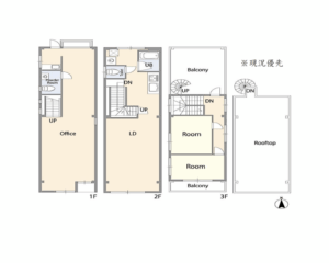 - ・間取り:1階店舗テナント(2/17退去)/2〜3階+テラス+屋上